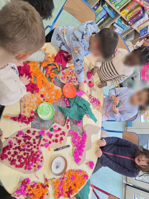Les enfants ont découvert la notion de pollinisation de manière ludique, en s’inspirant des abeilles 🐝, papillons 🦋 et autres petits pollinisateurs indispensables à la vie des plantes. Une approche artistique qui donne du sens aux apprentissages et encourage l’observation du monde qui nous entoure 🌍